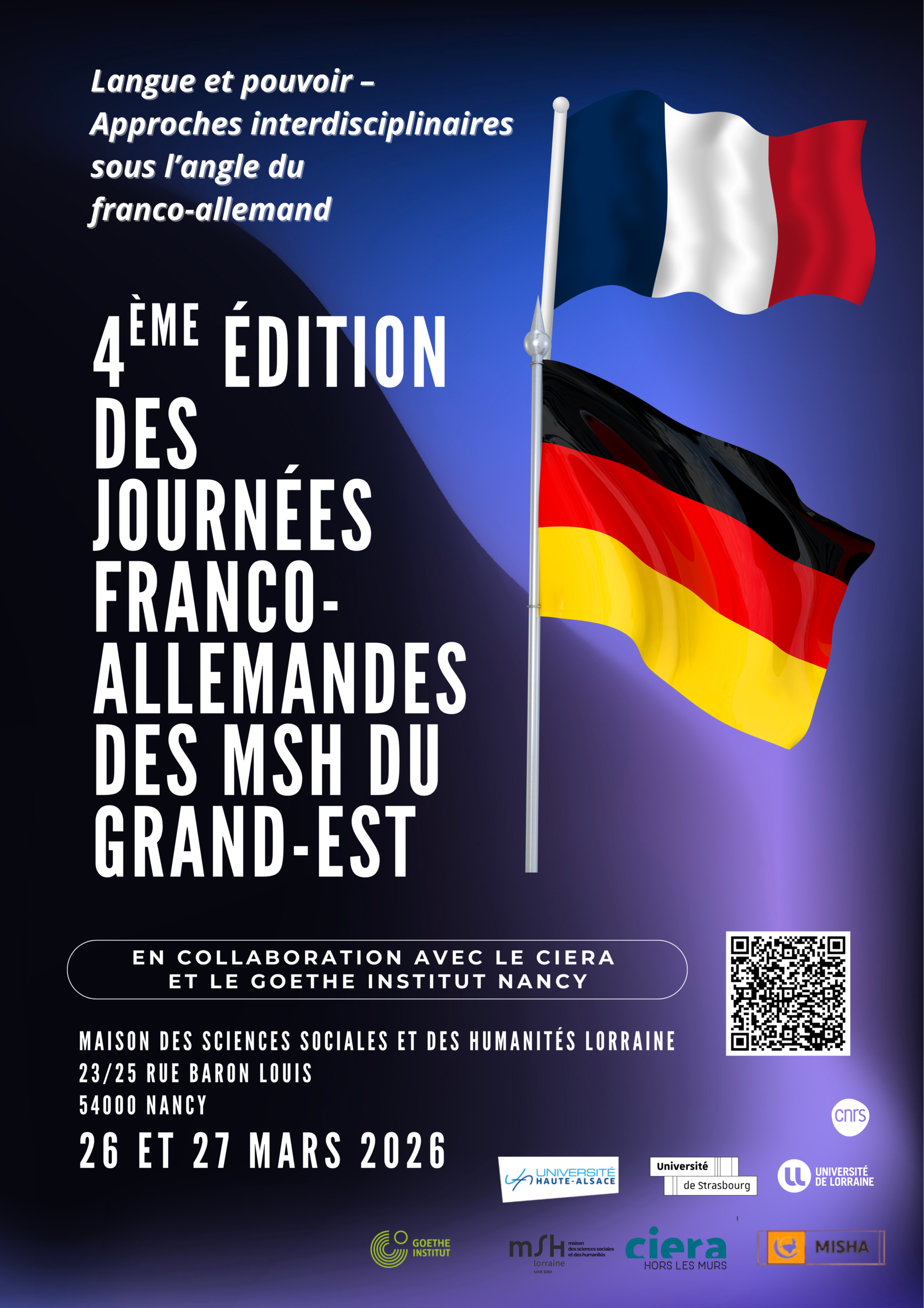 Les 26 et 27 mars 2026, la MSH Lorraine (Nancy) accueillera la 4ème édition des journées franco-allemandes des MSH du Grand Est, organisées en collaboration avec le CIERA. Cette édition sera consacrée aux relations entre langue et pouvoir dans une perspective interdisciplinaire et franco-allemande.